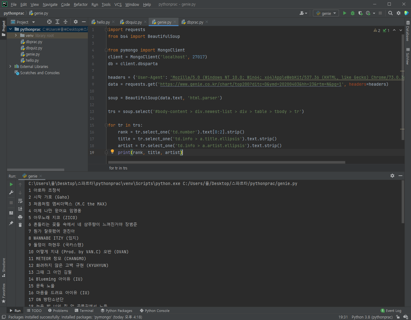 크롤링과 pymongo, robo3T를 통한 DB를 학습했다. 기본 코드를 받아서 대입하면서 하는 것은 이해가 간다. 하지만 눈에 익을 때까지는 연습이 많이 필요할 것 같다.