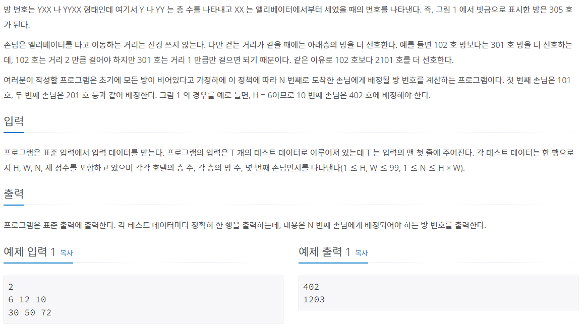 - 인원수를 높이로 나눈 나머지가 0이 아닌 경우 층수는 인원수를 높이로 나눈 수에 100을 곱해주고 / 호수는 인원수를 높이로 나는 수의 정수값에 1을 더해준다