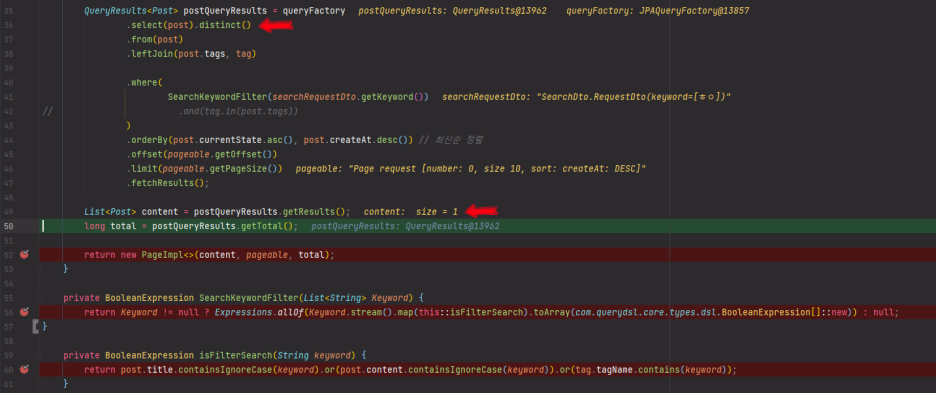 - .distinct()라는 중복제거 쿼리문을 넣어주면서 size가 1로 바뀌었다.
