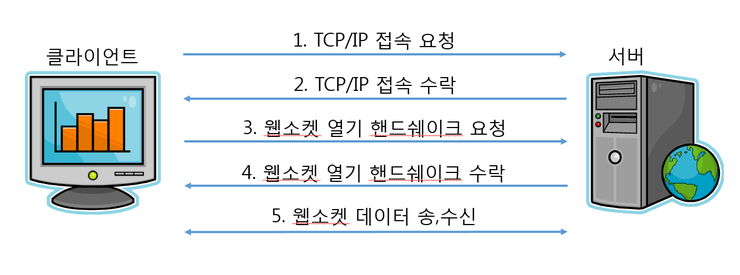 웹소켓을 이용하여 서버와 클라이언트가 통신을 하려면 먼저 웹소켓 접속 과정을 거쳐야 한다. 웹소켓 접속 과정은 TCP/IP 접속 그리고 웹소켓 열기 HandShake 과정으로 나눌 수 있다. 웹소켓도 TCP/IP위에서 동작하므로, 서버와 클라이언트는 웹소켓을 사용하기 전에 서로 TCP/IP 접속이 되어있어야 한다. TCP/IP 접속이 완료된 후 서버와 클라이언트는 웹소켓 열기 HandShake 과정을 시작한다.