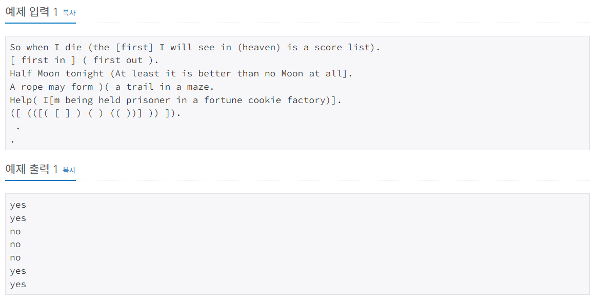 - 이렇게 스택의 길이가 0이면 'yes'를 출력, 0이 아니면 'no'를 출력