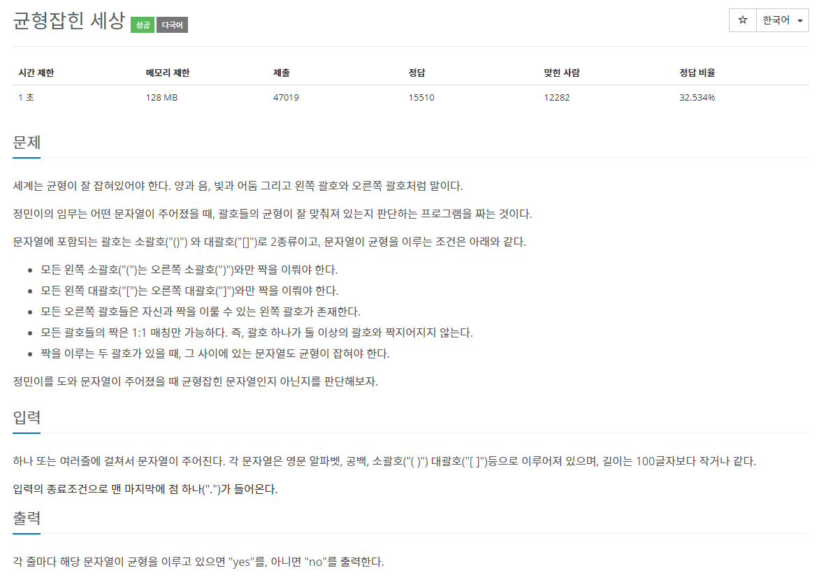 - i가 ']'이나 ')'가 나올 때 stack의 길이가 0이 아니고, stack의 top이 '['나 '('가 나오면 stack에서 pop을 해준다