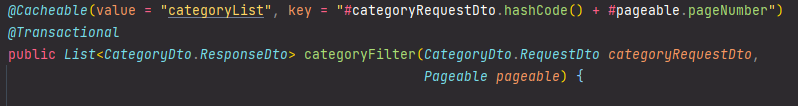 @Cacheable(value = "categoryList", key = "#categoryRequestDto.hashCode() + #pageable.pageNumber")