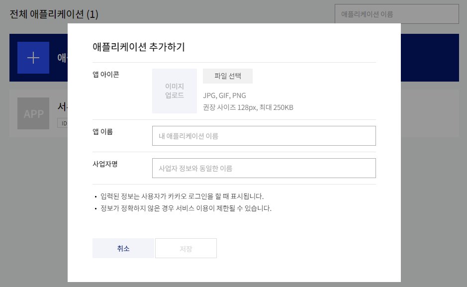 사용 전 꼭 페이지 왼쪽 아래에서 키를 발급받아야 한다. 애플리게이션 추가하기를 눌렀고 앱이름, 사업자명에 모두 내 이름을 넣었다.