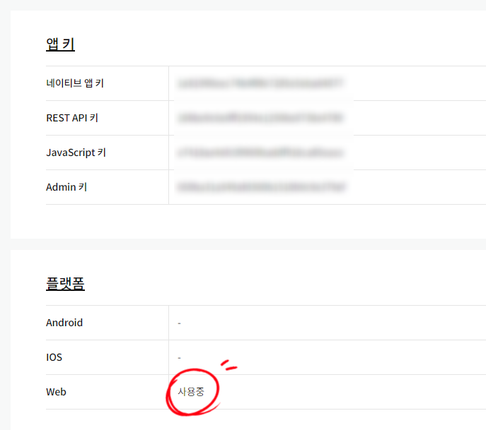 그리고 만들어진 카드를 클릭하면 아래와 같은 화면이 뜨는데 앱키를 바로 사용하지 않고 본인이 사용 할 플랫폼을 등록해야한다.