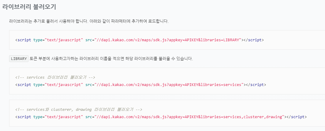 <script type="text/javascript" src="//dapi.kakao.com/v2/maps/sdk.js?appkey=자바스크립트키&libraries=LIBRARY"></script>
