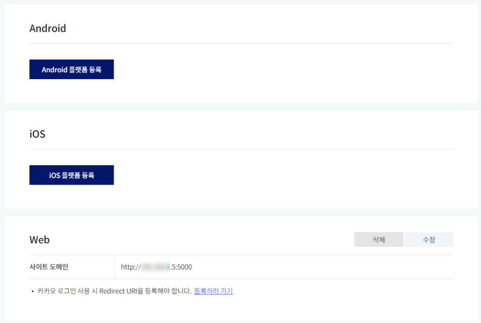 플랫폼은 왼쪽 메뉴에서 등록할 수 있으며 사이트는 내가 만들고 있는 아직 서버가 없는 주소를 입력했다. 플랫폼 등록이 완료되면 이후 키 사용하기!