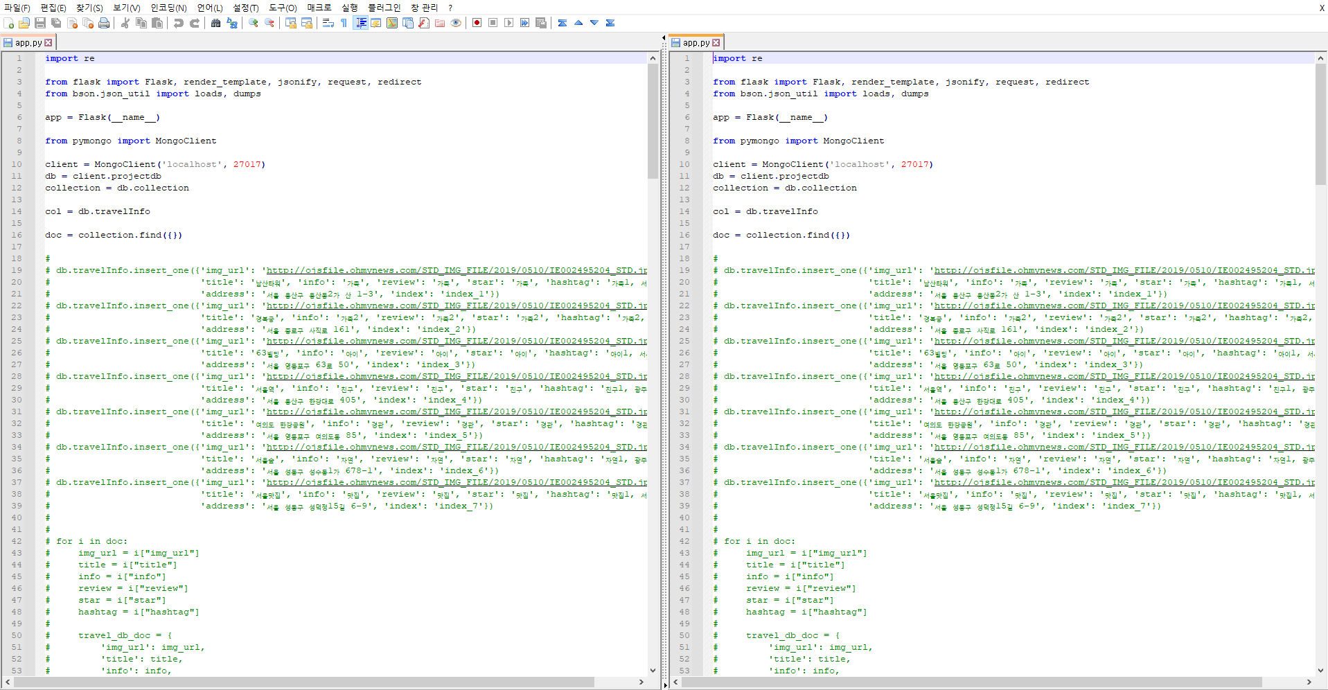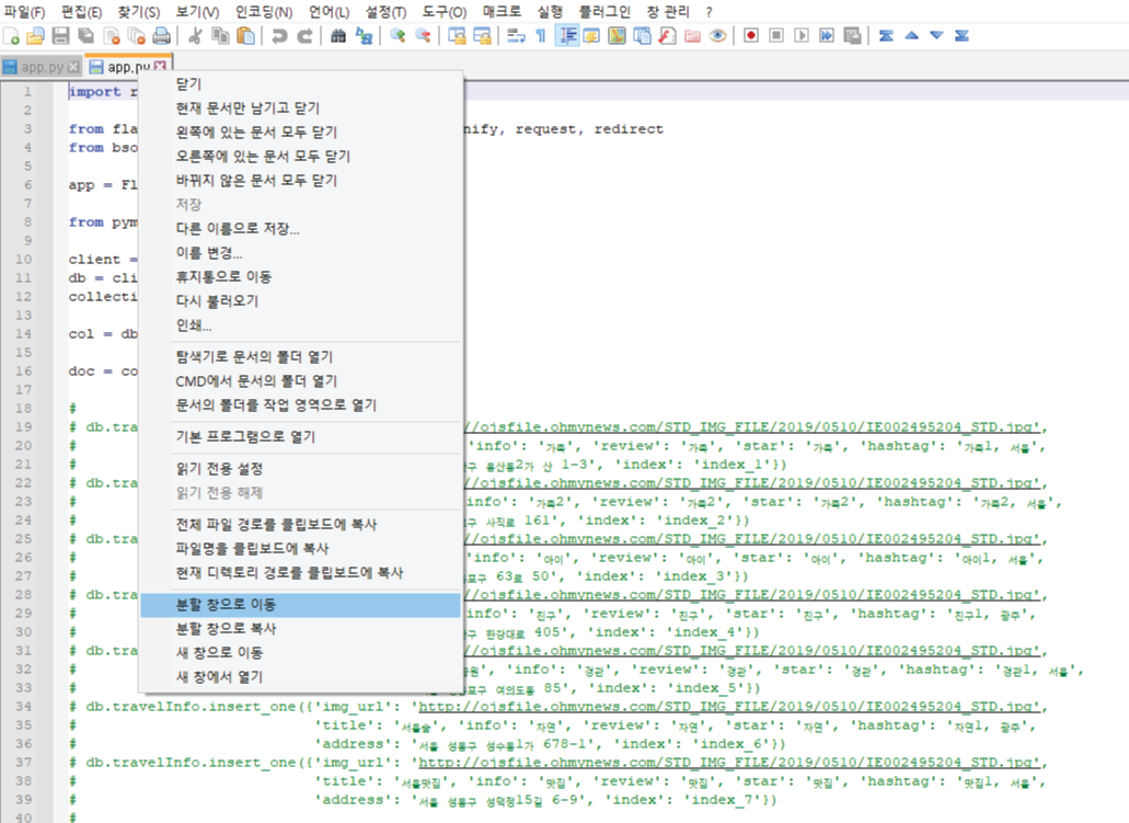 Compare 플러그인 설치를 확인했으면 '파일 - 열기'를 통해 비교하고 싶은 파일을 2개 열고, 파일 2개 중 1개의 파일 이름탭에 '마우스 오른쪽 클릭 - 분할창으로 이동'을 눌러 오른쪽과 같이 창을 나란히 열어줍니다.