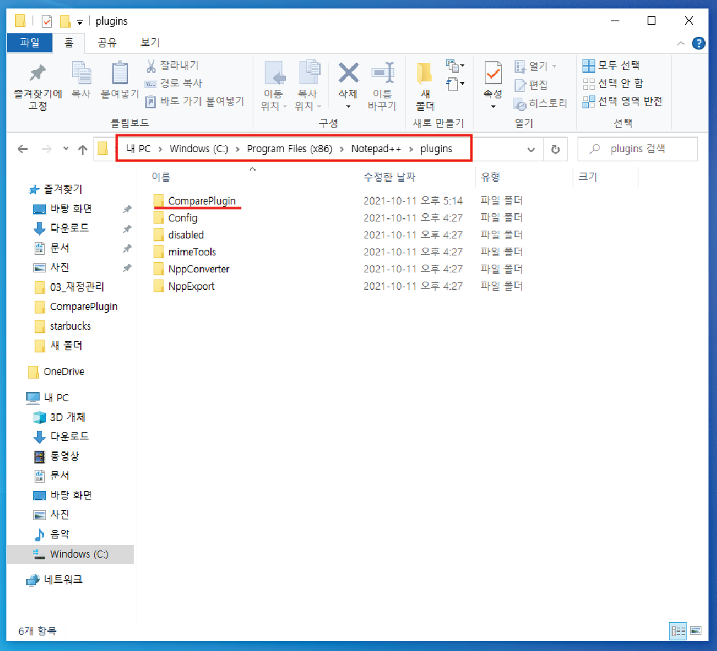 내PC - Windows(C) - Program Files - Notepad++ - plugins 에 접속하여 'ComparePlugin'폴터를 만들어줍니다. 폴더명은 반드시 'ComparePlugin'로 해야합니다! 그리고 만들어진 폴더에 5번에서 등록했던 ComparePlugin.dll파일을 넣어줍니다.(저는 이 방법을 몰라 반나절을 헤맸네요ㅠ_ㅠ)