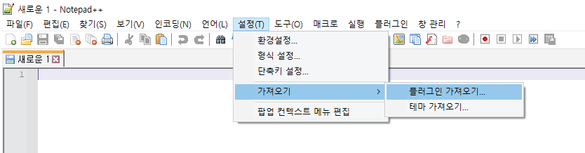 다시 notepad++에서 '설정 - 가져오기 - 플러그인 가져오기'를 클릭하고 좀 전에 dll파일을 가져옵니다.