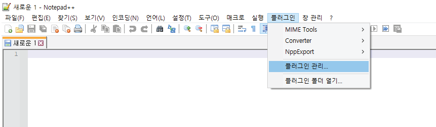 2. notepad++ 실행시켜 플러그인 - 플러그인 관리 클릭