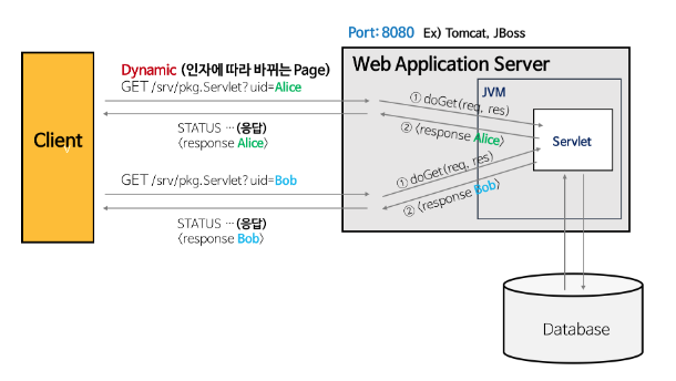 - 실행된 메소드는 동적인 페이지를 생성한 후 HttpServletResponse 객체에 응답을 보냄