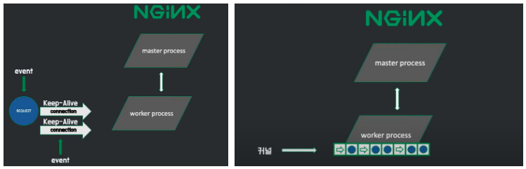 - 비동기 이벤트 기반 구조 : HTTP 요청이 수 천 개여도 정해진 수의 프로세스(worker procss)가 이 요청들을 이벤트로 등록하고 비동기 방식으로 대기시켜 완료되는 요청(이벤트)부터 응답(처리)해주는 것