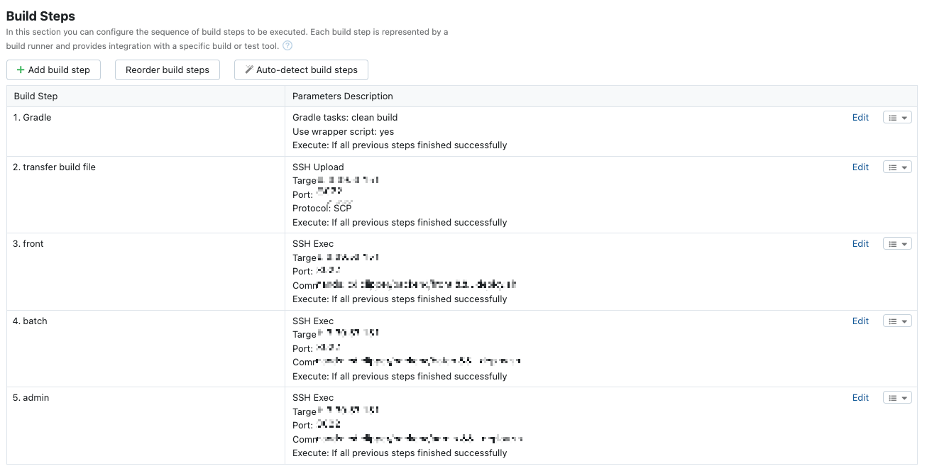 빌드테스트 후 2번째 단계에서 SSH Upload로 파일을 서버로 업로드 한 후 3~5번째 단계에서 SSH Exec로 각각의 프로젝트를 빌드 했다.
