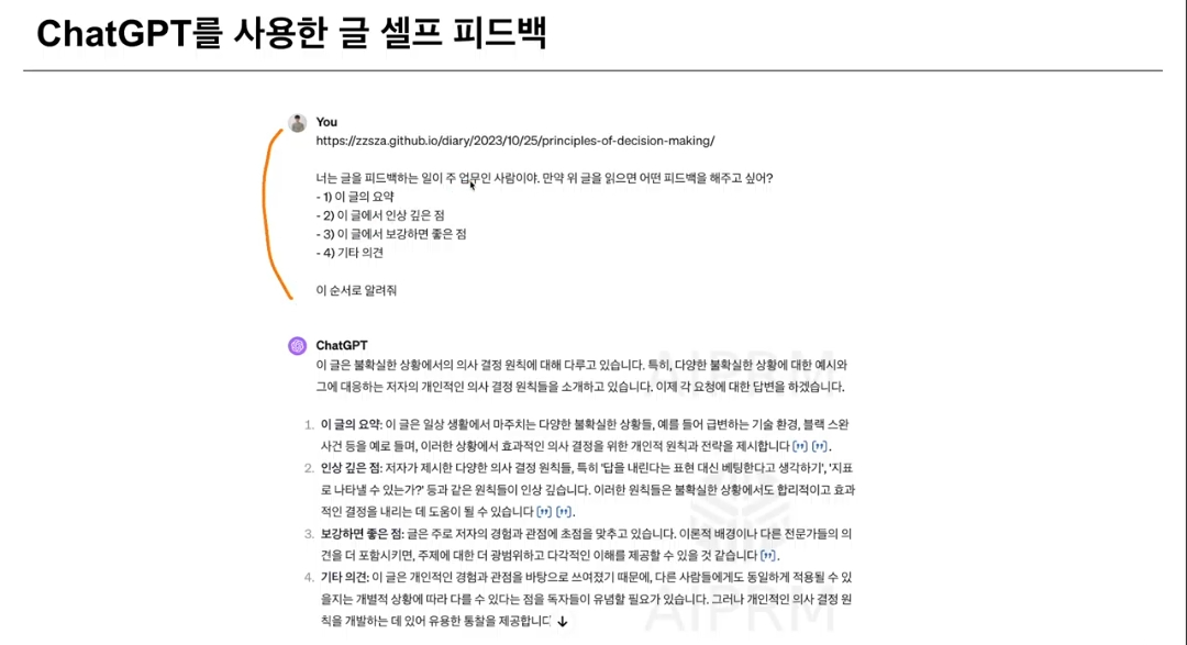 - 현실적으로 어려운 문제에 대해서는 인정하고 유연하게 대처할 수 있는 방법을 알려주어 더 와닿았다. 예를 들어 편성된 조에서 사람대 사람으로 글을 피드백 하는게 현실적으로 좋게 말하면 제대로 피드백하지 않은느낌이 들고 안좋은 부분을 이야기하면 기분나쁠 수도 있는데 이부분을 gpt를 활용해서 피드백할 수도 있다고 말씀해주시고 직접 질문한 내용까지 보여주셨다!