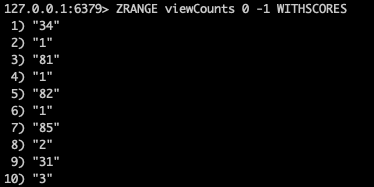 127.0.0.1:6379> ZRANGE viewCounts 0 -1 WITHSCORES