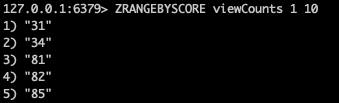 127.0.0.1:6379> ZRANGEBYSCORE viewCounts 1 10