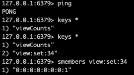 # set을 사용한 사용자 확인 로직은 smembers로 view:set:34를 조회했더니 value에 ip값이 들어와 있다