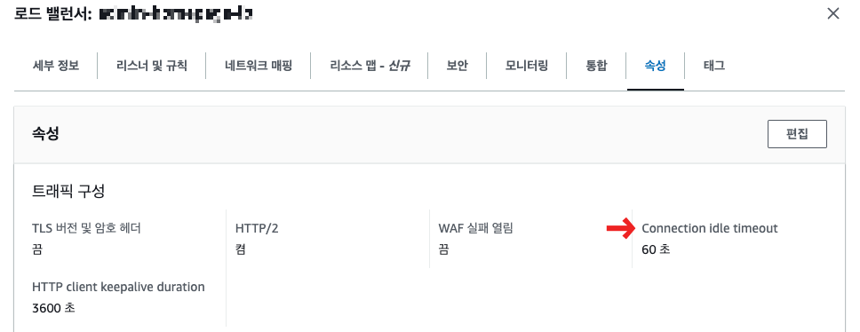 Nginx에서 원인을 찾지 못한 후, 로드밸런서의 설정을 점검했다. AWS 콘솔을 확인하다가 'Connection idle timeout'값을 확인하게 되었다.
