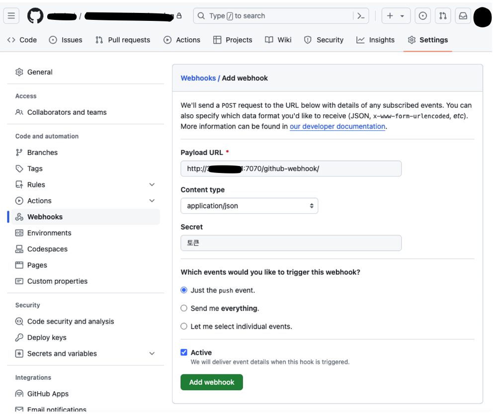 - 레포 - Settings - Webhooks에서 webhook 설정
