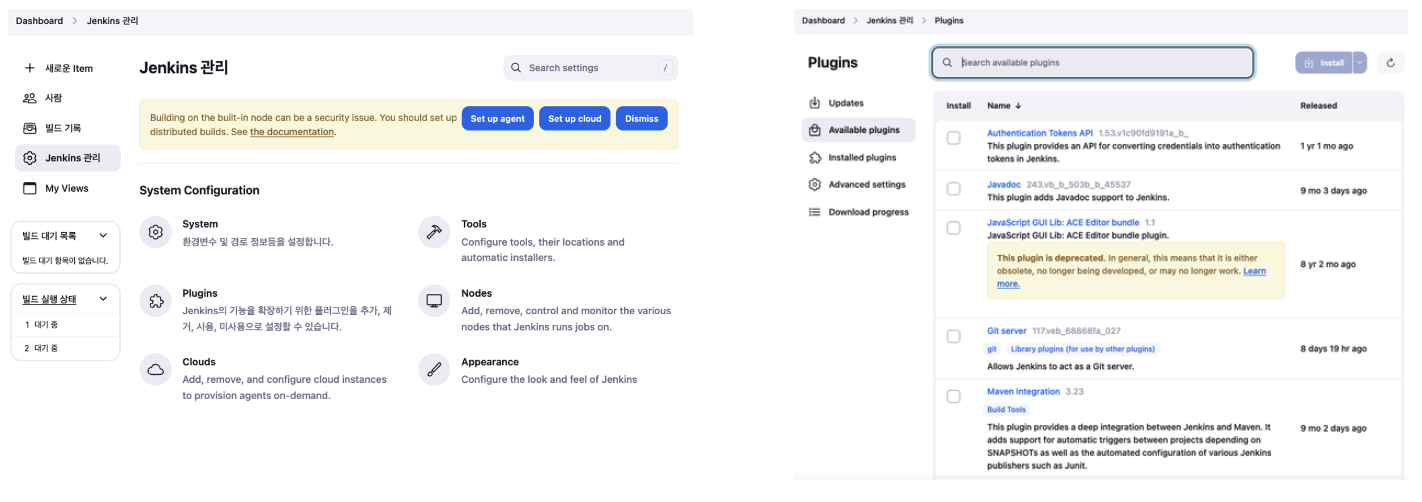 3. 필요한 플러그인 설치 되었는지 확인 : jenkins 관리 - Plugins