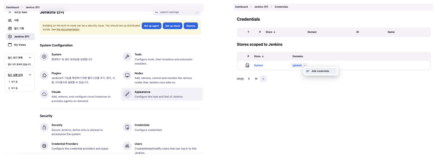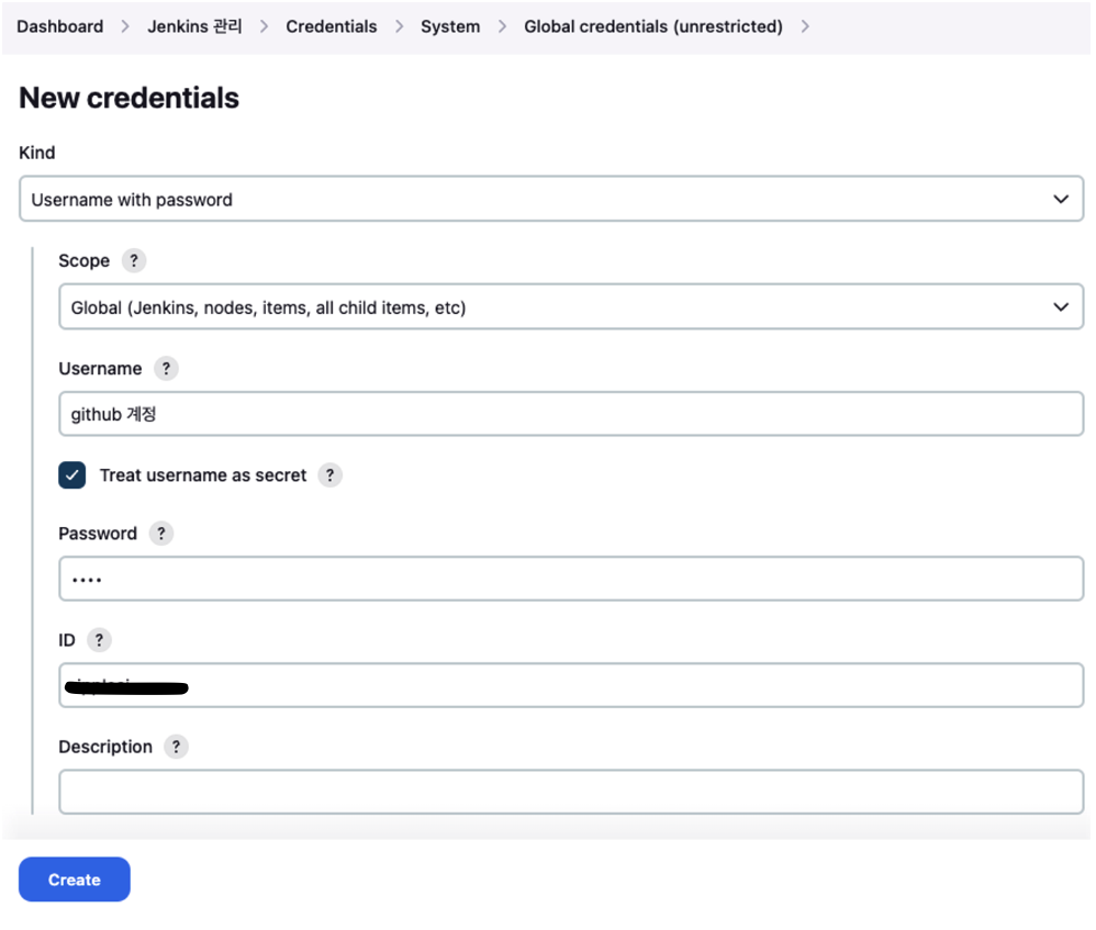 4. 사용자 인증 : jenkins관리 - credentials - add credentials