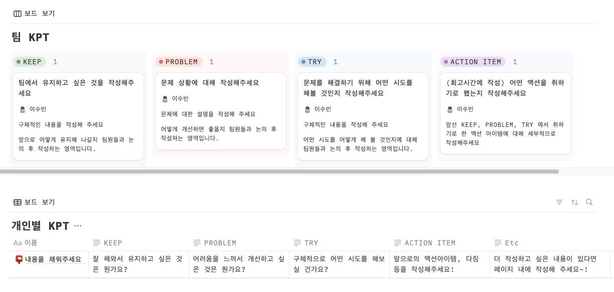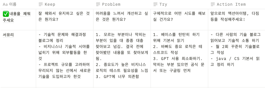 - Keep (유지할 점) : 팀, 개인, 프로젝트에서 잘했던 점 계속 유지하고 싶은 부분
