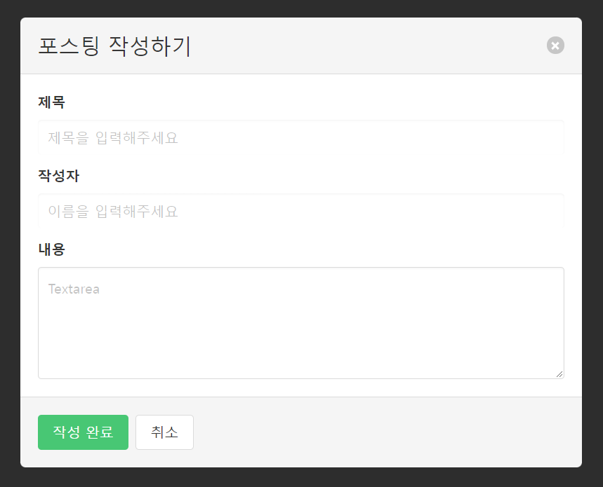 - 두번의 프로젝트 경험이 있지만 모달창은 처음만들어봤다. 버튼을 클릭할 때 포스팅작성하기 모달창이 뜨고 X표시나 취소 버튼을 누르면 모달창이 꺼지는 script