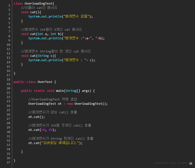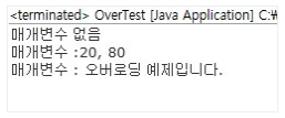 - 두 메서드가 같은 이름을 갖고 있으나 인자의 수나 자료형이 다른 경우