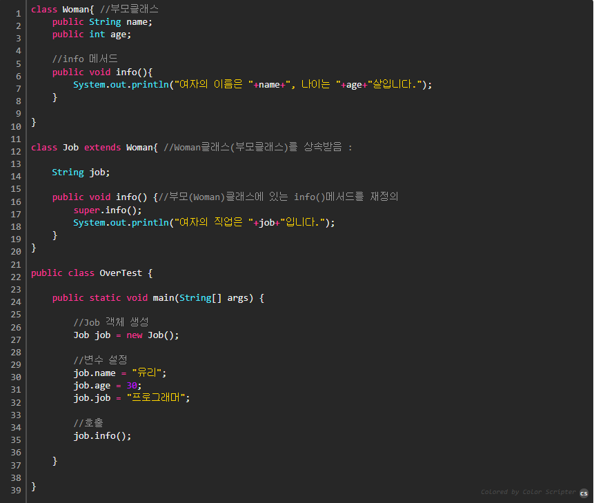 - 메서드의 이름, 매개변수, 반환형이 같을 경우 상속받은 메서드를사용