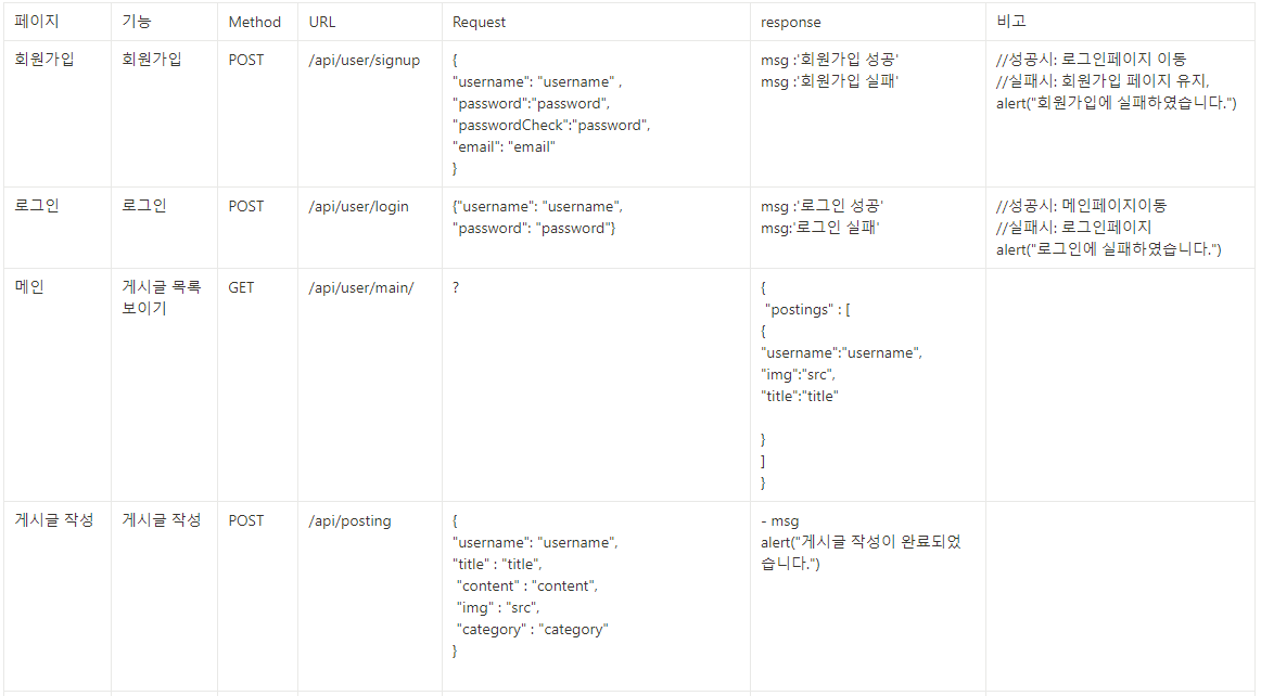 - 1주차 이후 다시 시작해본 팀프로젝트다. 이번에는 프론트엔드와의 협업!! 지금까지 배운내용을 완벽히 이해하지 못했는데 팀프로젝트라 조금 걱정이 된다. 게다가 스프링의 두분도 오늘 처음 같이 팀이 되었다. 우리조는 모두 비전공자라 API설계부터 조금 어려웠지만 새로운 기능을 추가하지 않고 배운 내용을 활용해 완성하는 것을 목표로 하여 단순 기능구현에는 크게 어려움이 없을 것 같다.